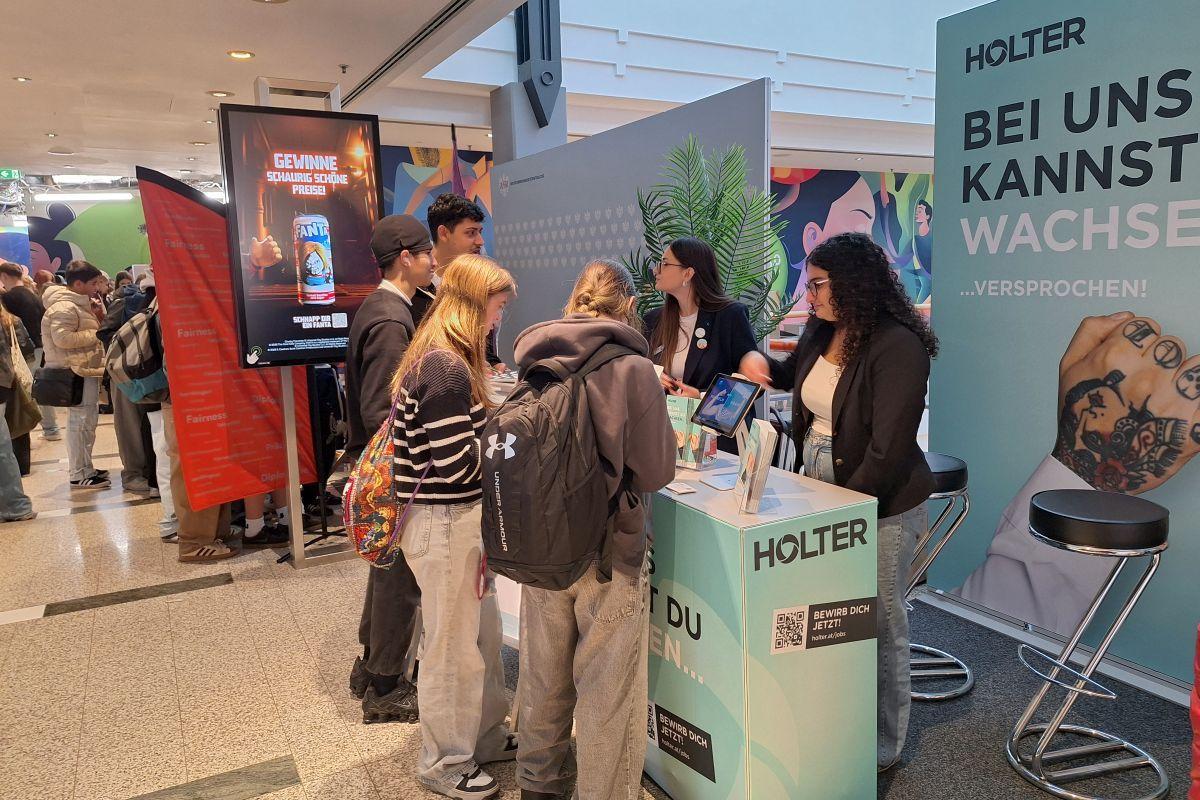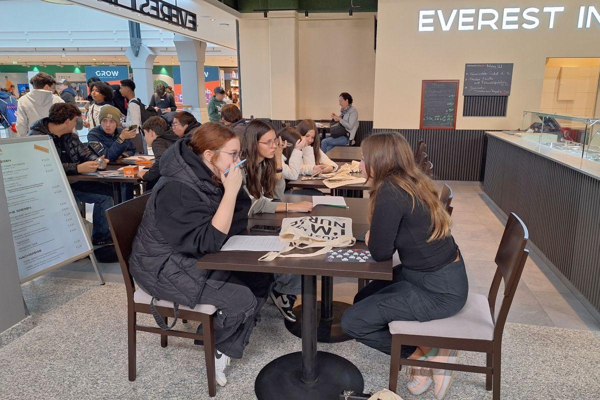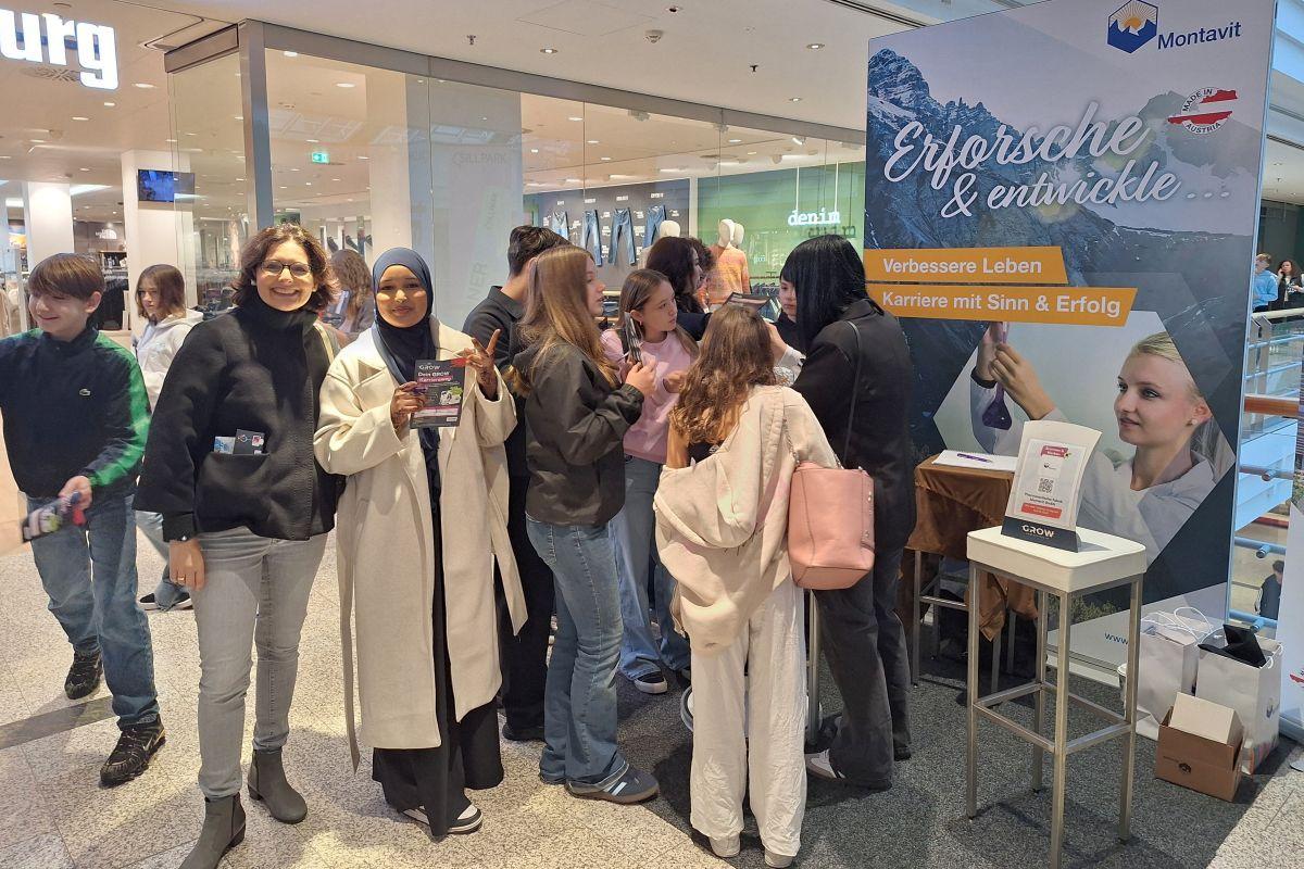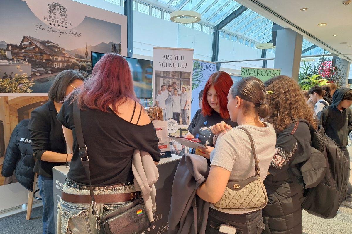Apropos „wachsen“: Die Berufsmesse GROW bot da unseren Schüler/innen am 23.10. im SILLPARK zahlreiche Möglichkeiten, um Berufe und Unternehmen aus der näheren Umgebung kennen zu lernen. Da gab es natürlich die bei solchen Gelegenheiten üblichen kleinen Geschenke (Getränke, Kugelschreiber, Duschgel, Gutscheine), die zum Teil am Glücksrad erspielt werden mussten. Im Mittelpunkt standen aber 17 Stände, an denen die Jugendlichen Informationen und Unterlagen einholen, aber auch Tätigkeiten ganz praktisch ausprobieren durften.